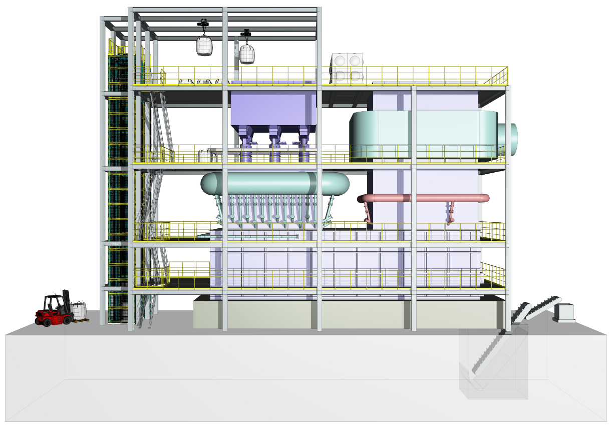 本方案以石油焦粉為主燃料(原料),干化污泥等其余固廢為輔助燃料,黏結(jié)劑為輔料,先經(jīng)成球工藝成球成為球狀的SRF,SRF再送入熔融爐(絕熱爐膛)內(nèi)燃燒熔融,產(chǎn)生約1300℃的爐膛高溫?zé)煔?,再混?40℃回流煙氣降溫至800℃~900℃(鍋爐入口平均煙氣溫度~850℃)進(jìn)入用戶余熱鍋爐。
